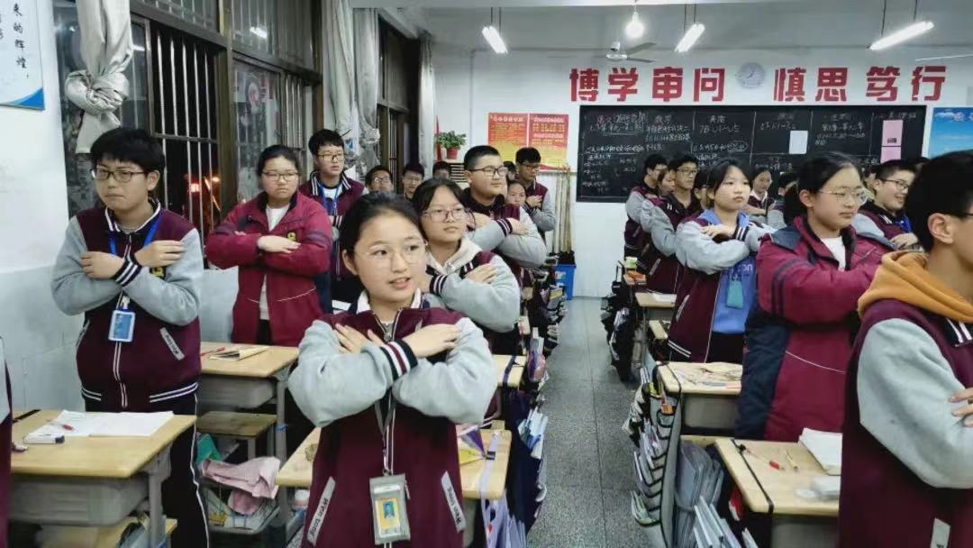 晚上八点整,《笑起来真好看》的甜美歌声在淮安市文通中学各口教室里响起,学生们将坐凳挪到走道一侧,起身、直立,随着舒缓的音乐,做起了趣味无限的座位操。