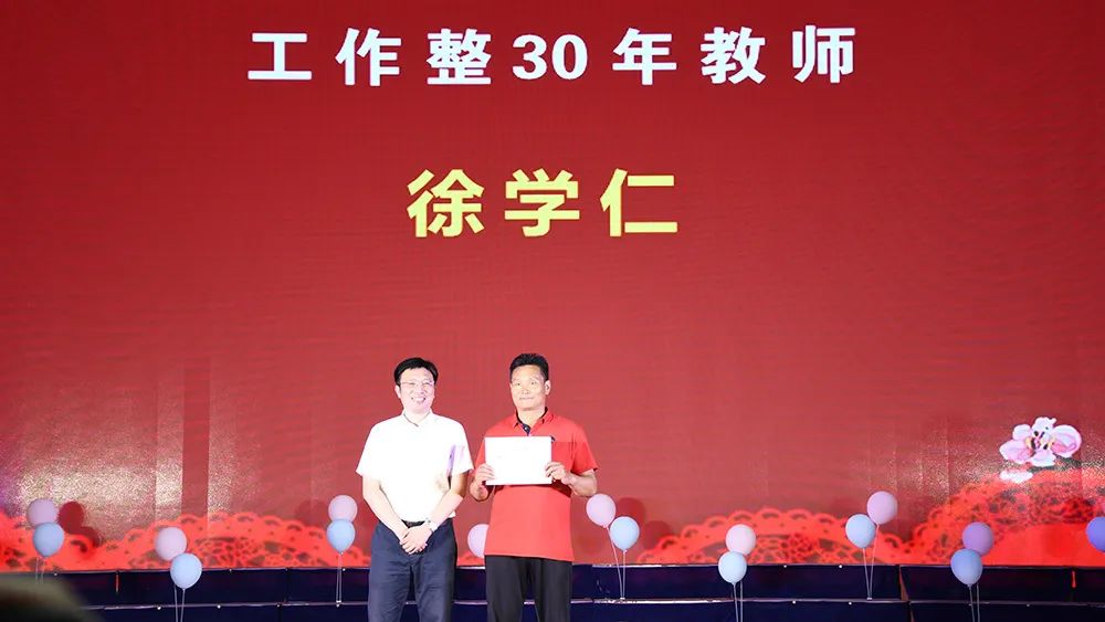 在激昂的乐曲声中,校领导为21名“优秀备课组长”、40名“优秀班主任”、12名“明星教师”、6名“管理明星”、18名优秀员工和优秀宣传员及工作10年、20年、30年的教师等颁发荣誉证书并送上节日的祝福。