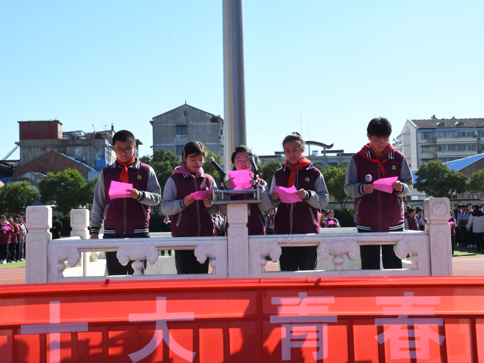 全校师生在校操场全体整齐列队,随着主持人发出指令,文通旗手迈着铿锵的步伐入场,国歌响起,全体师生神情严肃,注视着鲜艳的五星红旗冉冉升起,祝福伟大的祖国繁荣昌盛。