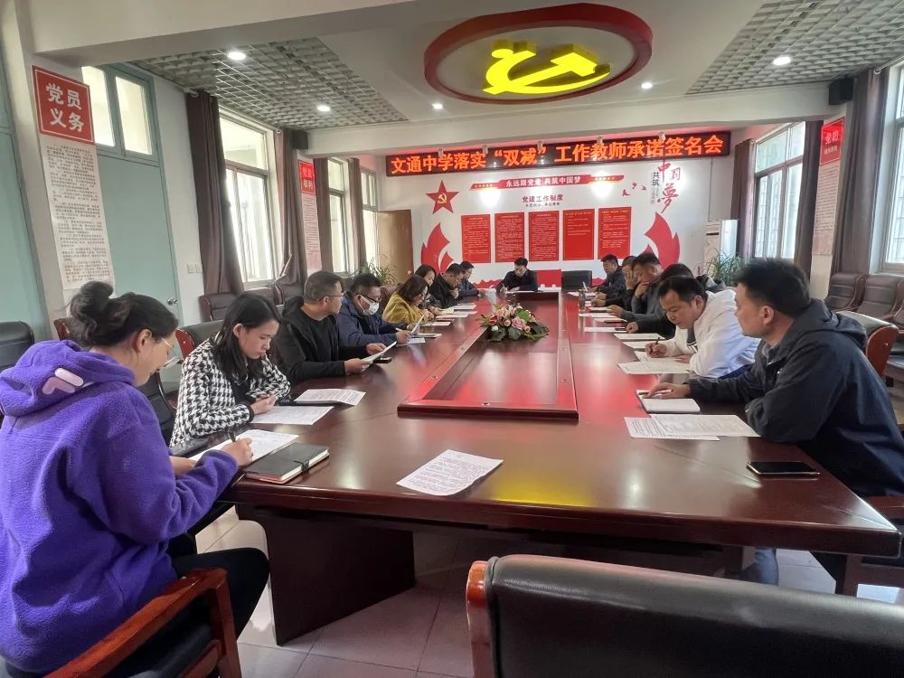 为坚决贯彻中央决策部署,深入推进“双减”工作,规范教师教学行为,2022年10月10日,文通中学在行知楼三楼召开落实“双减”工作教师签名工作部署会,并签订了“双减”承诺书。为进一步规范教师教学行为,着力提升我校教育教学质量明确了方向。