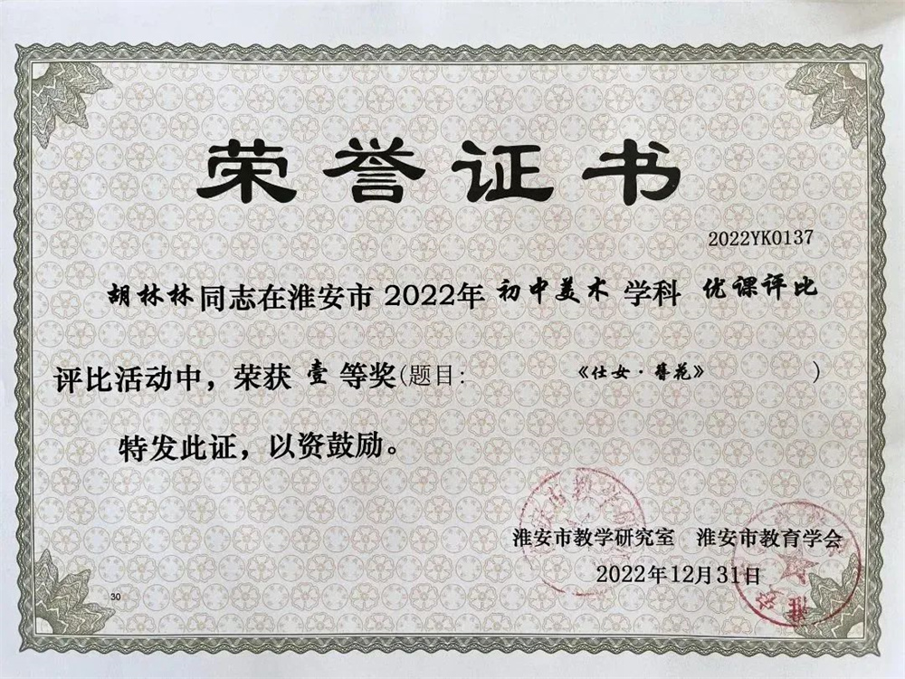 百舸争流竞展风采,青春放歌三尺讲台。在2022年淮安市初中美术优课评比活动中,我校胡林林老师设计的《仕女•簪花》荣获一等奖。