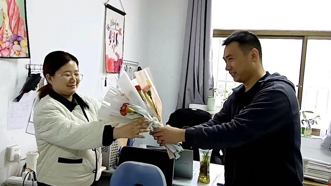年级领导也向男教师的家人送上了鲜花和祝福,感谢她们一直以来对学校工作的支持。