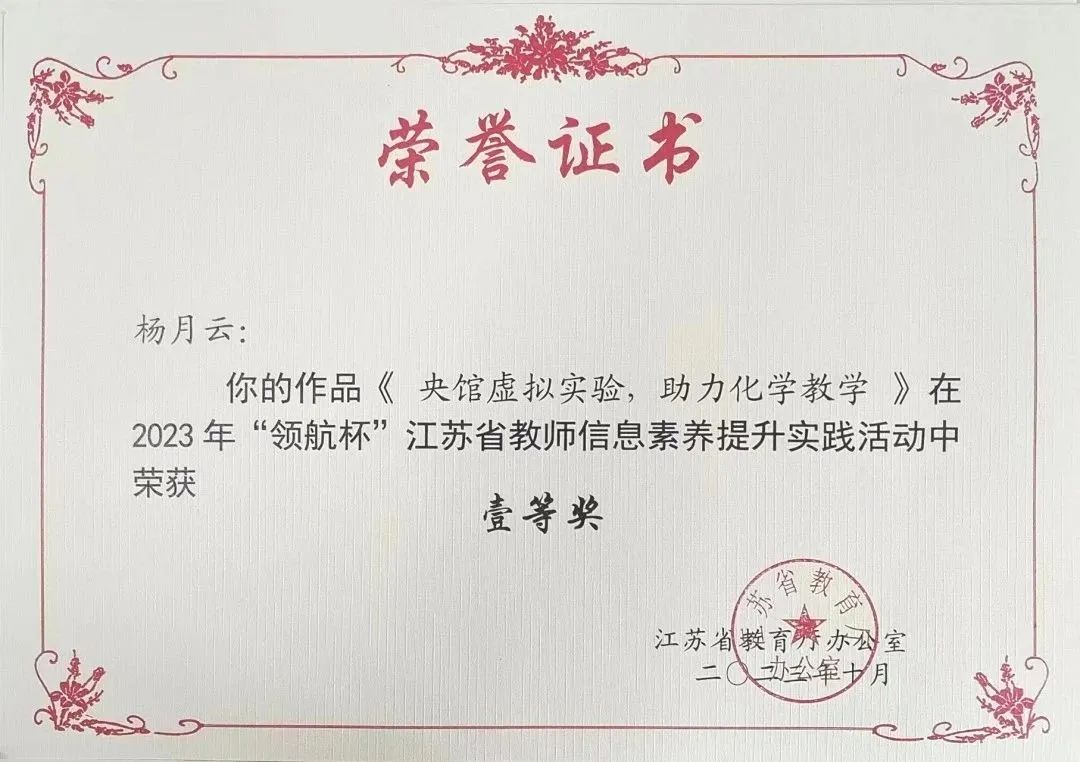 近日,省教育厅公布2023年“领航杯”教师信息素养提升实践活动获奖作品名单,淮安有18人在省赛中获奖,一等奖6人,一等奖获奖数占全省1/8。其中,我校杨月云老师的《央馆虚拟实验,助力化学教学》(微课)荣获一等奖。