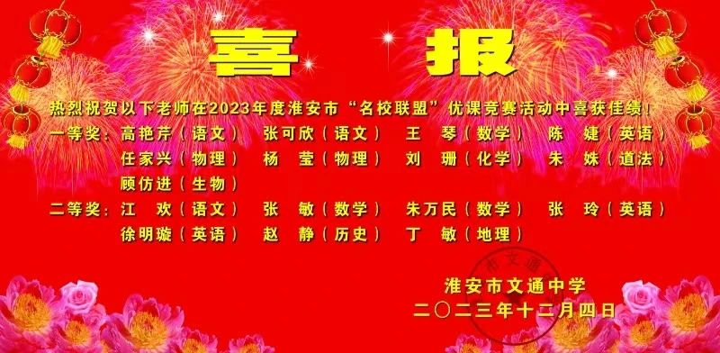一枝独秀不是春,百花齐放春满园。为了践行2022新课标,落实“双减”政策,推进淮安市“名校联盟”工作深入开展,加强校际合作交流,提高区域学校教育水平,11月27—12月1日,淮安市文通中学、淮阴区开明实验学校、盱眙县第一中学、洪泽外国语中学、涟水淮文外国语学校联合开展2023年“名校联盟”学科优课竞赛评比活动。五所学校主管教学领导、各学段、学科相关教师都参与了研修活动。