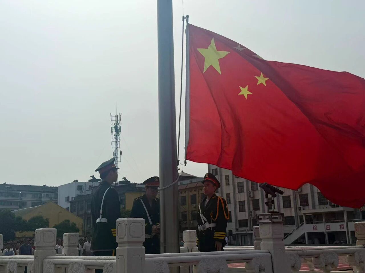 伴随着清脆的铃声,国旗护卫队队员身着整齐服装,迈着铿锵有力的步伐护送五星红旗走向升旗台。当激昂的《义勇军进行曲》奏响,五星红旗冉冉升起,全体师生肃立注目,嘹亮的歌声回荡在校园上空——这抹鲜红,不仅是国家的象征,更映照着师生间真挚的情谊。