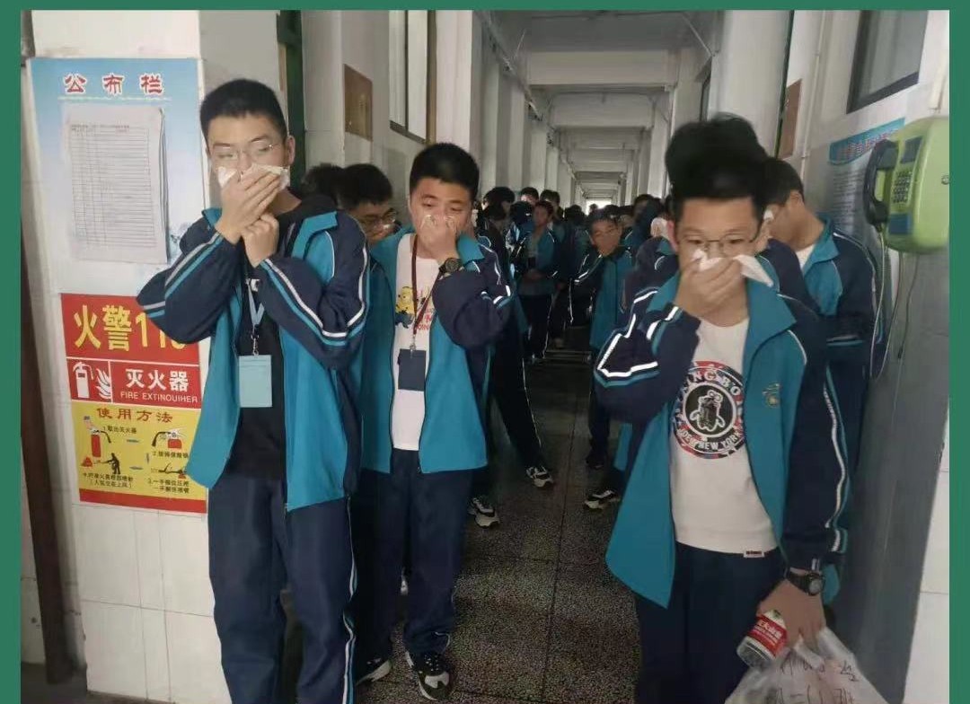 13:05分,随着一阵急促的哨声响起,学生们迅速躲避到宿舍安全地方,有效利用床板等保护头部,20秒钟后火灾警报拉响,在楼层生活老师的护导下,学生们按照应急预案中的逃生路线有序疏散至指定地点,用时仅1分35秒。