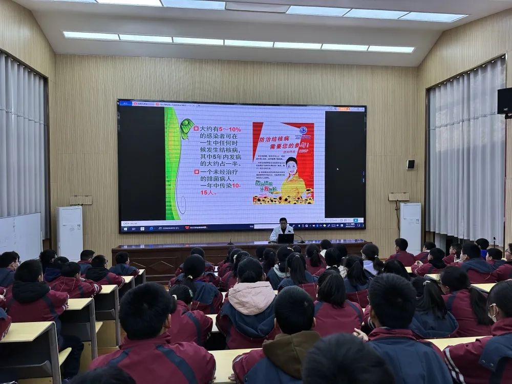 讲座上,区疾控中心专业技术人员结合自己的工作经验为在场师生上了一堂精彩的课程,他用生动的语言、直观的图文画面、形象的事例详细讲解了什么是结核病、肺结核有哪些常见症状、肺结核的危害、如何治疗和预防结核病、学校结核病常规预防控制措施等,并号召学生们要积极行动,从自身做起,平时养成良好的生活习惯,注重个人卫生,加强体育锻炼,均衡营养,增强抵抗力,有效降低肺结核的传播风险。同时,疾控工作人员还通过在校园大屏、向学生们发放宣传手册等方式,普及结核病防治知识。