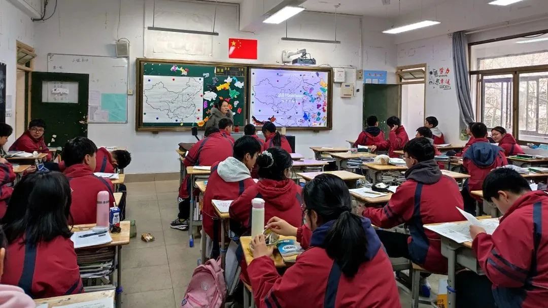 王雪芹老师在黑板上先是挂上了一幅巨大的中国政区图,并让同学上黑板拼中国地图,台上的一位同学举起“陕西省”“广西省” ……的地图犹豫不决,不知放在哪里,台下同学有的在努力翻书帮助他找答案,有的同学跃跃欲试想上台一展身手……最终在台下的“场外人员”协助下,台上的同学完成了拼图。