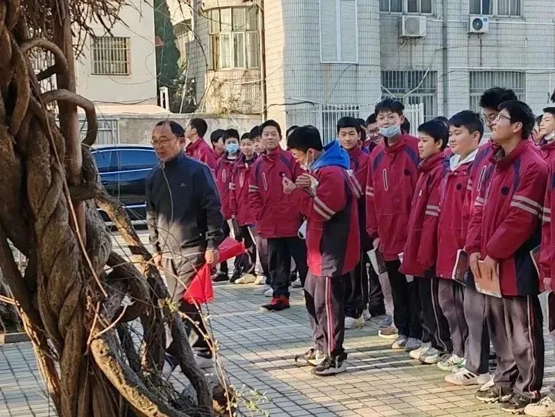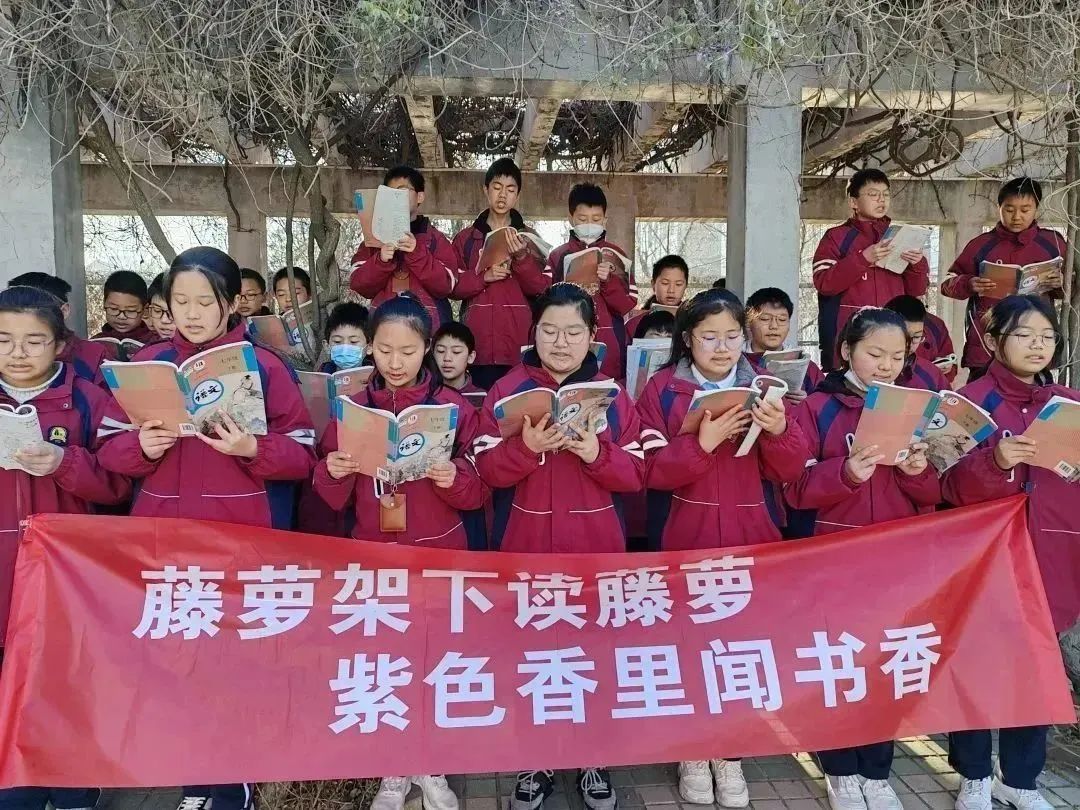 周一早上语文晨读,宗开权老师已经早早来到了初一(2)班的教室,对同学们宣布:“今天的晨读内容为《紫藤萝瀑布》,我们学校食堂门口就有紫藤,一会我们就去紫藤那儿读吧!”。同学们真是兴奋,随着宗老师一声“走!”,只见他们迅速抓起桌上的语文书,以八百米的速度冲出教室排队。伴着微风,跟着宗老师的步伐,向着紫藤长廊走去。