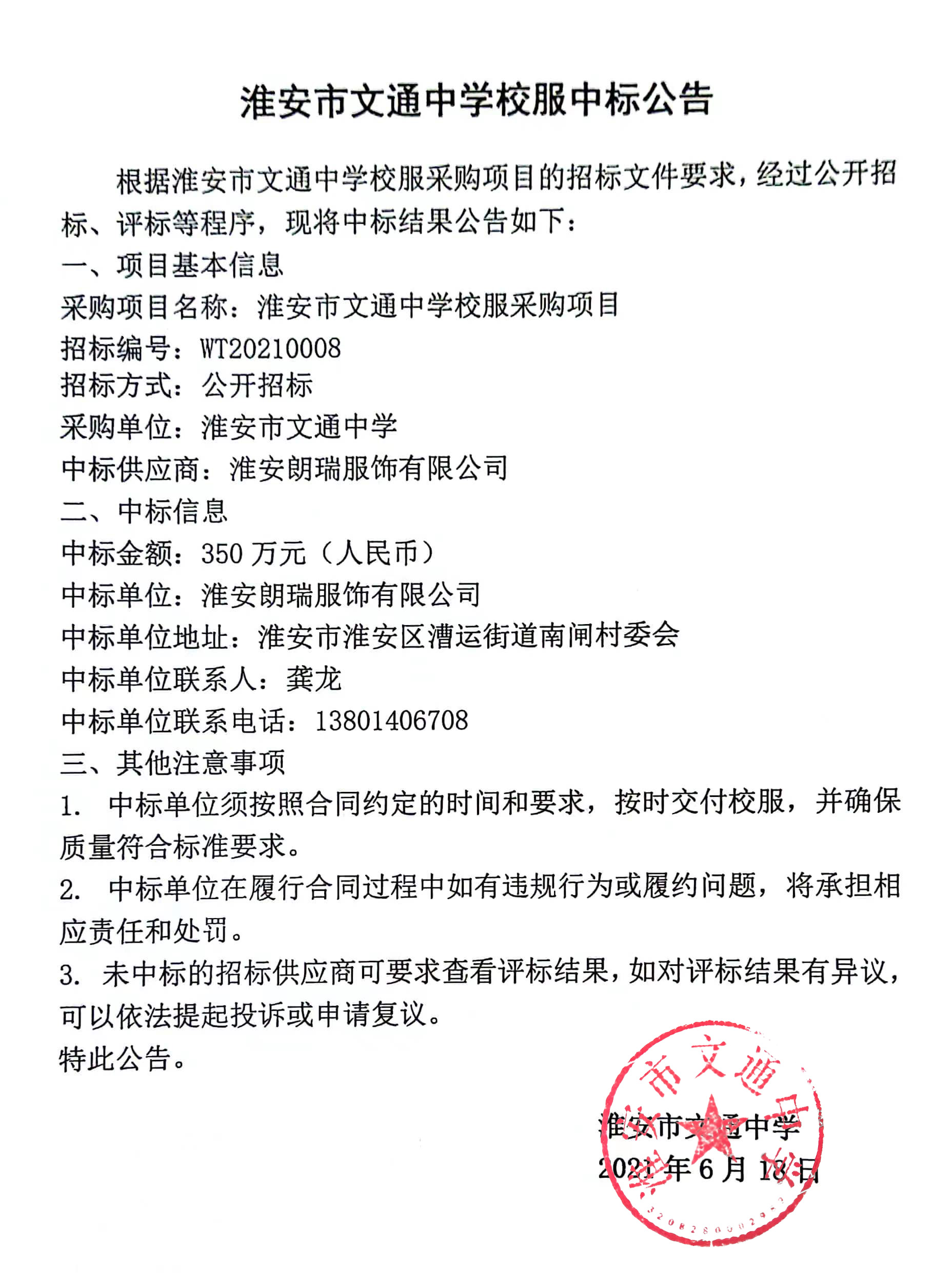 淮安市文通中学校服中标公告