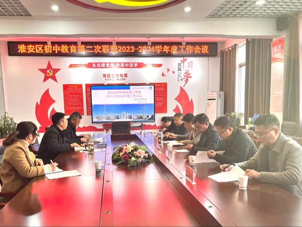 风正潮平,自当扬帆破浪;任重道远,更须奋鞭策马。为贯彻落实“双减”、特色学校建设、习惯养成教育等,促进淮安区基础教育普惠优质均衡提升发展,以及加强教育联盟校际之间的交流与学习,11月20日,淮安区初中教育第二联盟2023—2024学年度工作部署会在我校召开。淮安市范集中学、南闸中学、博里初级中学、苏嘴中学、复兴中学的领导,文通中学校长龚鹏程,王爱宝副校长,教科室胡萍副主任等领导全程陪同参与活动。